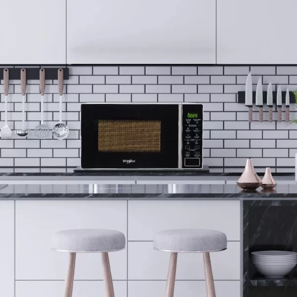 Microondas Whirlpool WMS20BS de 20 litros en acero inoxidable. Práctico, eficiente y con diseño moderno para el uso diario en la cocina.